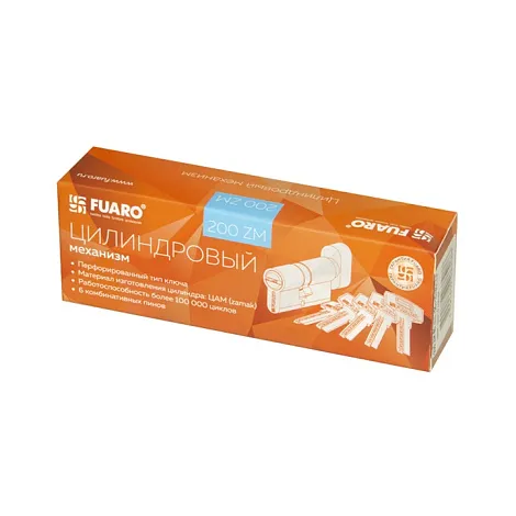 Цилиндровый механизм Fuaro 200 ZM предназначен для установки в корпуса врезных цилиндровых замков для всех типов дверей. Вариант исполнения: ключ-вертушка. Тип ключа: "перфорированный". Материал изготовления цилиндра: ZAMAK. Количество пинов: 6. Секретность более 10 000 комбинаций. Работоспособность более 100 000 циклов. Комплектация: 5 стальных ключей, крепежный винт 70 мм. Гарантия: 1 год.