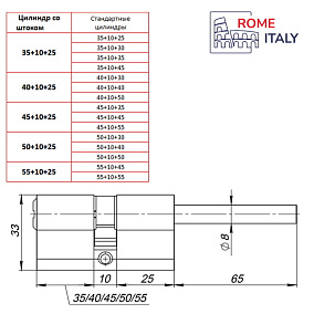 Цилиндровый механизм Punto коллекции ROME предназначен для установки в корпус врезных цилиндровых замков для всех типов дверей. Наличие проточек на штифтах данного цилиндра препятствует вскрытию замка отмычками. Вариант исполнения: ключ-шток. Вертушка в комплект не входит и приобретается отдельно. Тип ключа: "перфорированный". Материал ключа: сталь. Материал цилиндра: цинк. Материал ротора: цинк. Количество пинов: 6. Секретность: более 5 000 комбинаций. Работоспособность: более 200 000 циклов открывания/закрывания. Размер штока: 65 мм. Цвет: хром. Комплектация: 5 ключей, крепёжный винт. Упаковка: картонная коробка. Гарантия: 1 год.