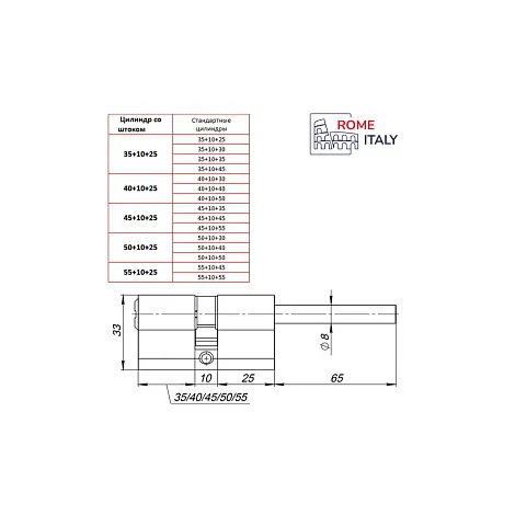 Цилиндровый механизм Punto коллекции ROME предназначен для установки в корпус врезных цилиндровых замков для всех типов дверей. Наличие проточек на штифтах данного цилиндра препятствует вскрытию замка отмычками. Вариант исполнения: ключ-шток. Вертушка в комплект не входит и приобретается отдельно. Тип ключа: "перфорированный". Материал ключа: сталь. Материал цилиндра: цинк. Материал ротора: цинк. Количество пинов: 6. Секретность: более 5 000 комбинаций. Работоспособность: более 200 000 циклов открывания/закрывания. Размер штока: 65 мм. Цвет: хром. Комплектация: 5 ключей, крепёжный винт. Упаковка: картонная коробка. Гарантия: 1 год.