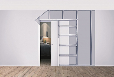 Пенал для раздвижной двери монтируют на этапе возведения перегородок. Он монтируется в проем перегородки из кирпича и других материалов. Монтаж полотна в пенал и короба производят на финальном этапе ремонта, после всех влажных пыльных работ.