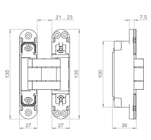 Невидимы на закрытой двери и обеспечивают угол открывания до 180 градусов. Бесшумны и плавны в работе за счёт нейлоновых вставок на подвижной части конструкции. Легко регулируются в трех плоскостях уже после завершения монтажа.