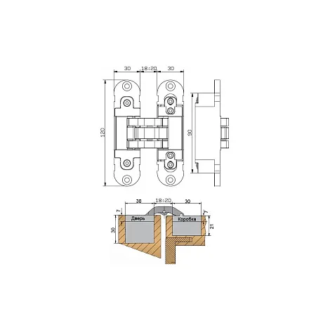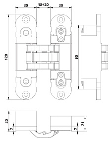 Универсальная реверсивная петля частично окрашенная Otlav Invisacta 3D 120x30 мм: для левых и правых дверей, при монтаже петель по середине толщины дверного полотна достигается реверсивность двери по вертикали и горизонтали для оптимизации складских запасов и логистики при установке. Плавный ход с малым трением благодаря 7 опорным точкам и нейлоновым вставкам. Регулировочные винты скрыты съемными декоративными накладками. Могут использоваться для противопожарных дверей (30 мин). Малая глубина врезки на стороне дверной коробки - 21 мм, угол открывания двери: 180 градусов. Гарантия: 1 год.