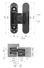 Скрытые петли Armadillo U3D5000 подходят для установки в деревянные двери, двери-невидимки, двери с алюминиевой кромкой. U3D5000 - универсальные петли для дверей с левым и правым открыванием. Петли скрытой установки U3D5000 предназначены для установки в межкомнатные двери толщиной от 38 мм. Рассчитаны на нагрузку до 60 кг при установке двух петель. Невидимы на закрытой двери и обеспечивают угол открывания до 180 градусов. Бесшумны и плавны в работе за счёт нейлоновых вставок на подвижной части конструкции. Легко регулируются в трех плоскостях уже после завершения монтажа. Регулируются в трех плоскостях: по горизонтали ±1 мм, высоте ±2,5 мм и притвору -1,5\+2 мм. Декоративные накладки входят в комплект. Соответствуют типоразмерам KUBICA K6360 и Anselmi 511/512. Гарантия: 1 год.