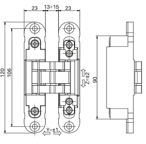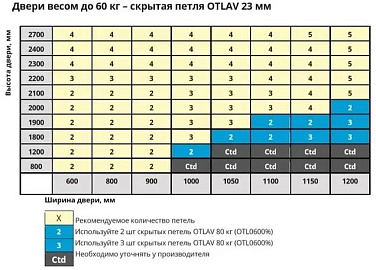 Универсальная скрытая петля частично окрашенная Otlav Invisacta 3D 120x23 мм: для левыхи правых дверей без наплава (четверти). Петля может устанавливаться на двери и коробки из дерева и алюминия. Максимальный вес двери: на 2 петлях: 60 кг, угол открывания двери 180°, вращение на 7 шарнирный осях для равномерного распределения нагрузки. Шарнирная часть оснащена износостойкимии долговечными шайбами из нейлона для исключениятрения между металлическими деталями. Регулировка в 3 направлениях с помощью одногошестигранного ключа 3 мм: боковая регулировка+ 1 мм, регулировка по высоте ± 2 мм, регулировка по прижим ± 1 мм. Материал шарнирной и регулировочнойчастей петли: цамак. Гарантия: 1 год.