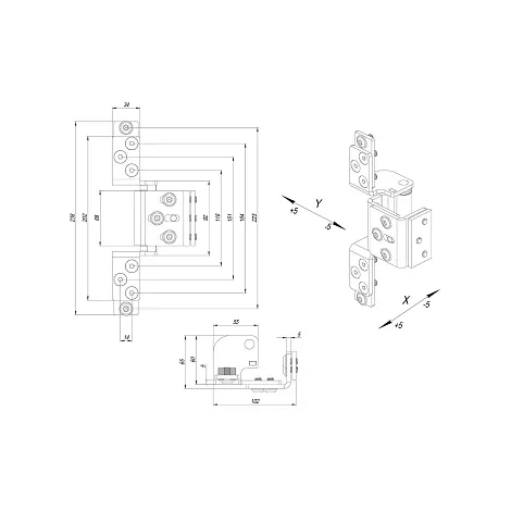 Скрытая петля для металлических дверей, актуальная и используемая во множестве современных дверей, в том числе и в крупных проектах федеральных застройщиков. Не видна, не мешает полёту дизайнерской фантазии, позволяет делать двери заподлицо со стенами или наличниками и при этом регулируема. Возможная толщина декоративной панели до 16 мм. Регулировка в двух плоскостях позволяет избегать или корректировать возможное провисание двери со временем, тем самым увеличивая срок службы двери. Для установки в дверных полотнах высотой до 2 375 мм, шириной до 1 150 мм. Регулировка по горизонтали (Х) +-5, по глубине (Y) +- 5 мм. Максимально допустимая нагрузка на 2 петли 120 кг, на 3 петли 150 кг. Материал петли, подшипников, валов, метизов и ключей: сталь с антикоррозионным покрытием. Кол-во циклов открывания - не менее 200 000. Угол открывания 120 градусов.