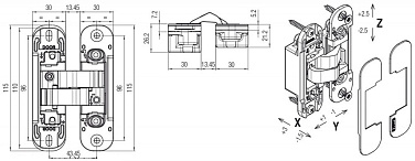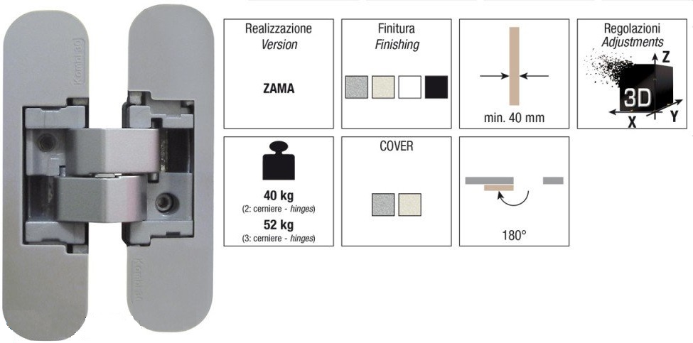 Петля универсальная скрытой установки Kubica K1000 DXSX S30, KOMBI 30 CR.SAT 40кг матовый хром
