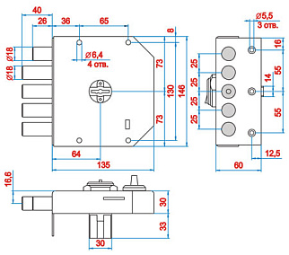 Накладной замок для дверей Elbor 1.06.61 MA усиленной конструкции, с запорной коробкой. Пять стальных цилиндрических стержня диаметром 18 мм, вылет 40 мм, 4-х ходовый механизм. Защита от криминального взлома, свёртывания, высверливания, перепиливания, выдавливания. Дополнительный 2-х ходовый засов в виде стального стержня диаметром 18 мм. Гарантия: 1 год.
