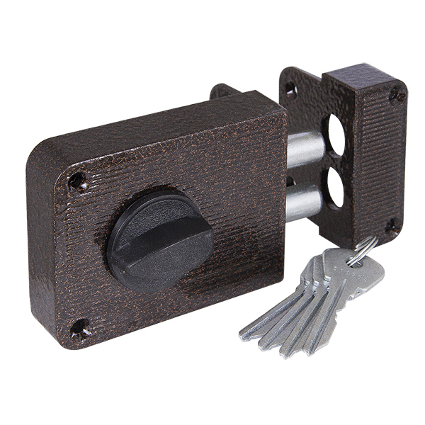 Замок накладной Zenit ЗН 1-3 предназначен для деревянных и металлических дверей. Корпус замка выполнен из цинкового сплава, ригели из стали. Имеется блокировка открывания двери ключом снаружи. Изнутри замок запирается ручкой. 2 класс секрета. Количество секретных комбинаций: 15 000. Два ригеля диаметром 14 мм. Комплектация: замок, цилиндровый механизм МЦ-1, 4 английских ключа, ответная планка, 1 накладка, крепежная фурнитура. Гарантия: 1 год.