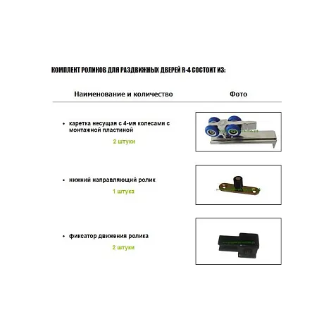 Механизм для раздвижных дверей R4 - для раздвижных дверей и перегородок с торцевым (боковым) креплением. В базовый комплект механизма входят: комплект роликов, верхняя направляющая (усовая и квадратная) и нижняя направляющая. Количество и метраж комплектующих меняется относительно количества раздвижных дверей в конструкции. Гарантия: 1 год.