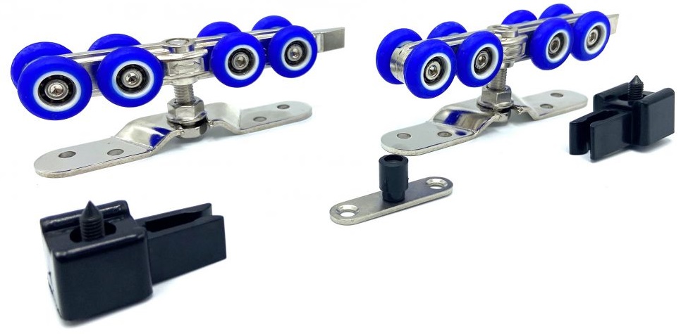 Ролики для раздвижных дверей артикул R-3017 - модель для подвеса тяжелых раздвижных конструкций. Модель ролика отличается не только прочной кареткой и подшипниковыми колесами, но и количеством колес - их 8 штук на одной каретке, что дает возможность подвешивать тяжелые раздвижные двери. Ролик может устанавливаться на раздвижные полотна шириной до 2-х метров, тогда в зависимости от веса полотна используется 4 каретки (для усиления). Комплект роликов для тяжелых раздвижных дверей состоит из: 2 каретки, 2 монтажные пластины, 2 стопора, 1 нижний направляющий ролик. Гарантия: 1 год.
