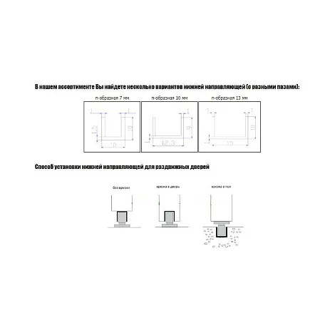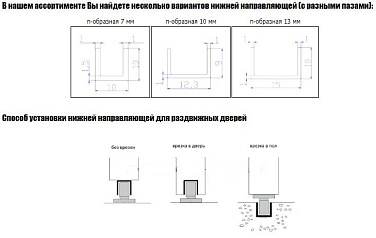 Нижняя направляющая для раздвижных межкомнатных дверей п-образная - это неотъемлемое звено раздвижной системы. Служит для предотвращения качания раздвижной двери. Нижняя направляющая может быть прикреплена тремя вариантами - без врезки к нижнему торцу двери, с врезкой в дверь и с врезкой в пол. Гарантия: 1 год.
