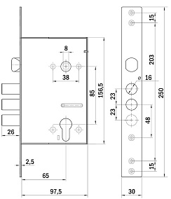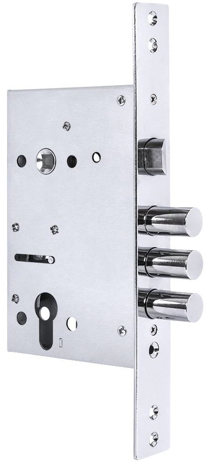 Корпус врезного цилиндрового замка PUNTO с тремя ригелями и защелкой предназначен для установки во входные металлические двери. Стальной оцинкованный корпус. Универсальная реверсивная защелка, подходит для левых и правых дверей. Отверстия под стяжные винты. Бэксет- 65мм. Выход ригелей- 26мм. Межосевое расстояние -85 мм. Диаметр ригелей -16мм. В комплект входит крепежная фурнитура. Гарантия: 1 год.
