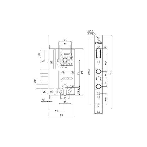 Корпус врезного цилиндрового замка Fuaro MDV811/C-60.85.3R14 с тремя ригелями и защелкой предназначен для установки во входные и технические металлические двери. Стальной оцинкованный корпус. Универсальная реверсивная защелка, подходит для левых и правых дверей. Отверстия под стяжные винты. Размер бэксета- 60 мм. Выход ригелей- 26 мм. Диаметр ригелей -14 мм. Открывание-2 полуоборота. В комплект входят: крепежная фурнитура, винт для евроцилиндра 70 мм. Гарантия: 1 год.