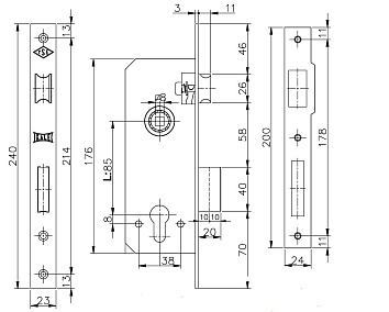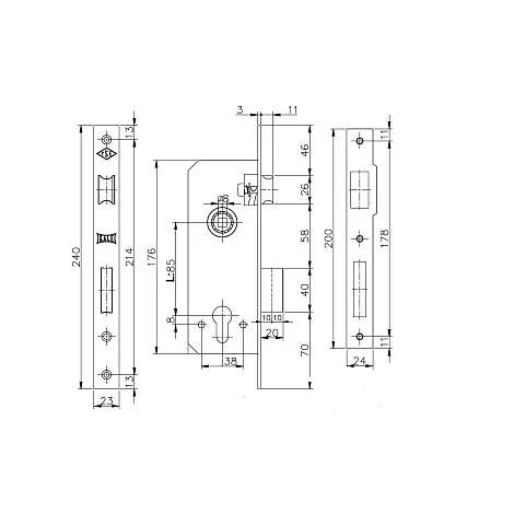 Корпус замка врезного цилиндрового Kale Kilit 152/R 60 мм, 1 ригель, 1 защёлка. Межосевое расстояние 85 мм. Расстояние от планки до центра цилиндра 60 мм. Гарантия: 1 год.