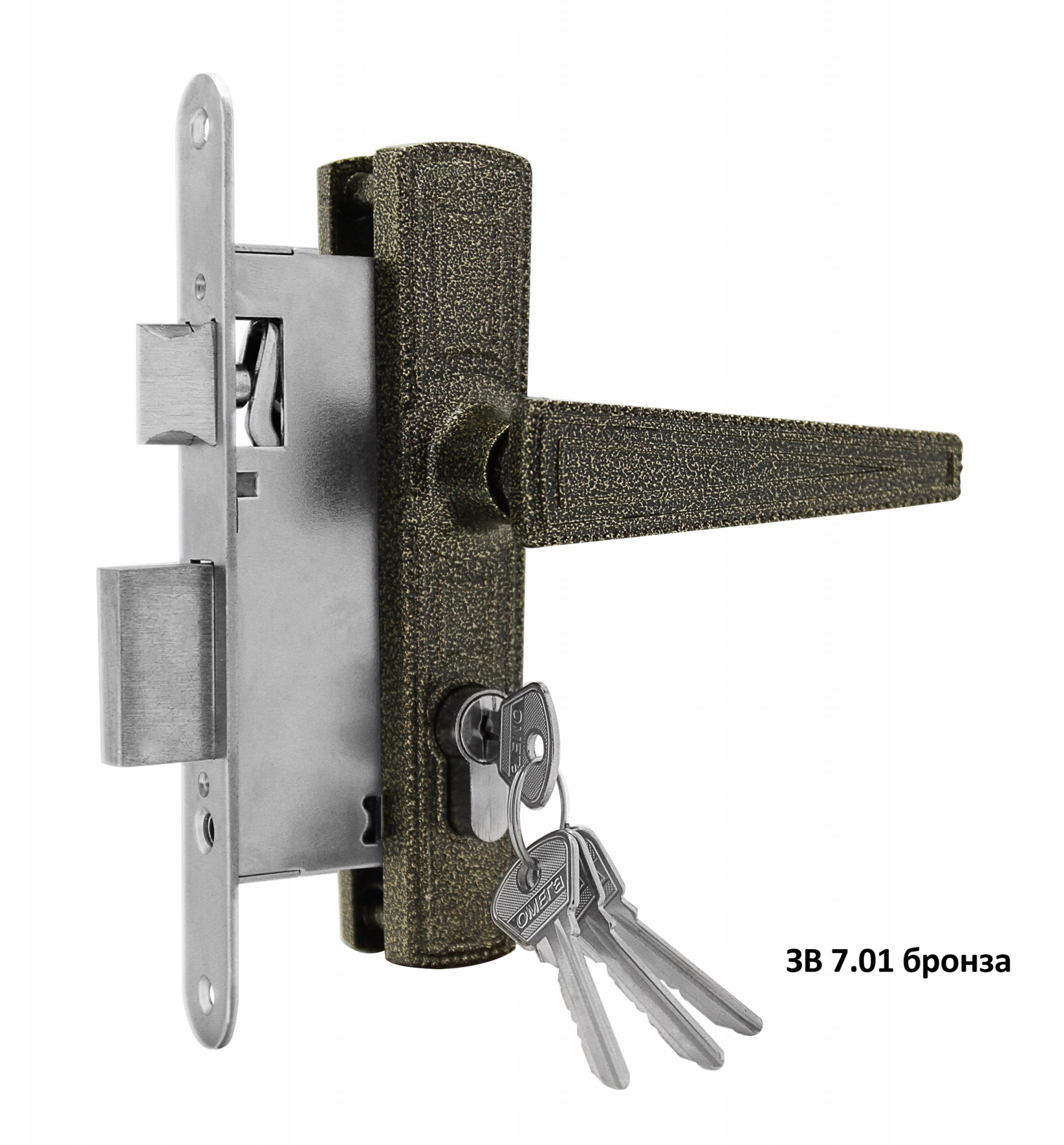Замок врезной цилиндровый с защёлкой в комплекте с ручкой Omega ЗВ7.01 (бронза), 4 кл.
