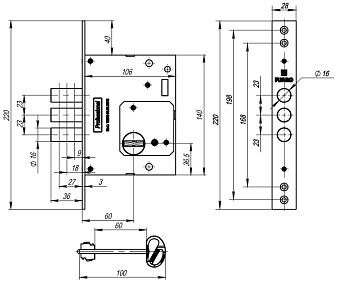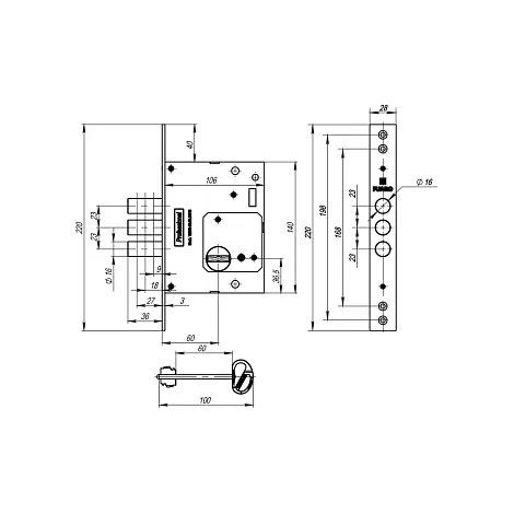 Замок врезной Fuaro сувальдный V25/S-60.00.3R16 4 ключа