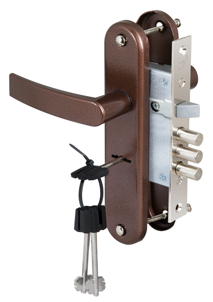 Замок врезной 6-сувальдный CAM ЗВ9-6/13 (КЛП5-85).РФ61-002.Ш3.У4 с защелкой и фалевыми ручками предназначен для установки в двери толщиной 40-50 мм. Замок универсальный, возможна установка как в правые, так и в левые двери. В комплекте: Накладки с фалевыми ручками (покрытие «медный антик»), 3 стальных ключа длиной 70 мм. Замок открывается и закрывается изнутри и снаружи ключом. Дверь может быть закрыта на защелку и открыта с помощью фалевой ручки при открытом сувальдном механизме. Покрытие лицевой планки — цинковое. Замок имеет защиту от высверливания, защиту от отмычек. Изготовлен из высокопрочных материалов. Имеет защитное покрытие. Количество секретных комбинаций - 120 000. Вылет ригелей — 21 мм, диаметр ригеля — 11 мм. Бэксет - 48,5 мм. Гарантия: 1 год.