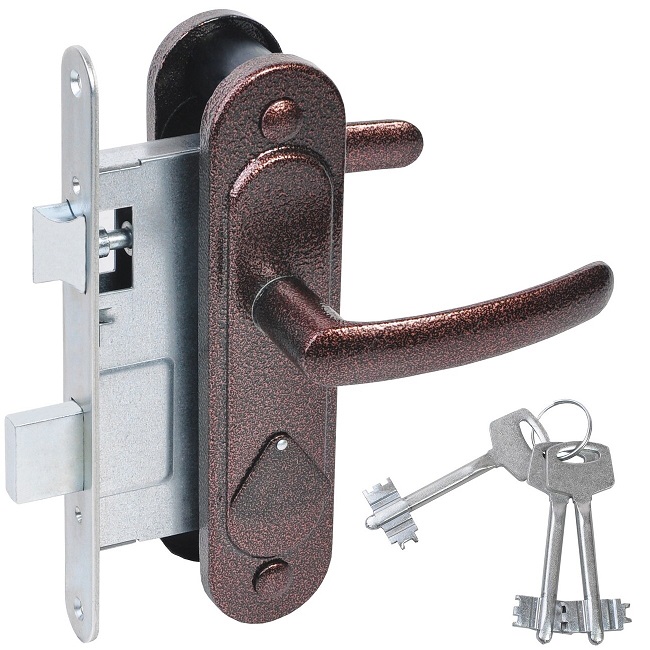 Замок врезной сувальдный с защёлкой в комплекте с ручкой Absolyut ЗВ9.2-08 (медь антик), 3 кл.